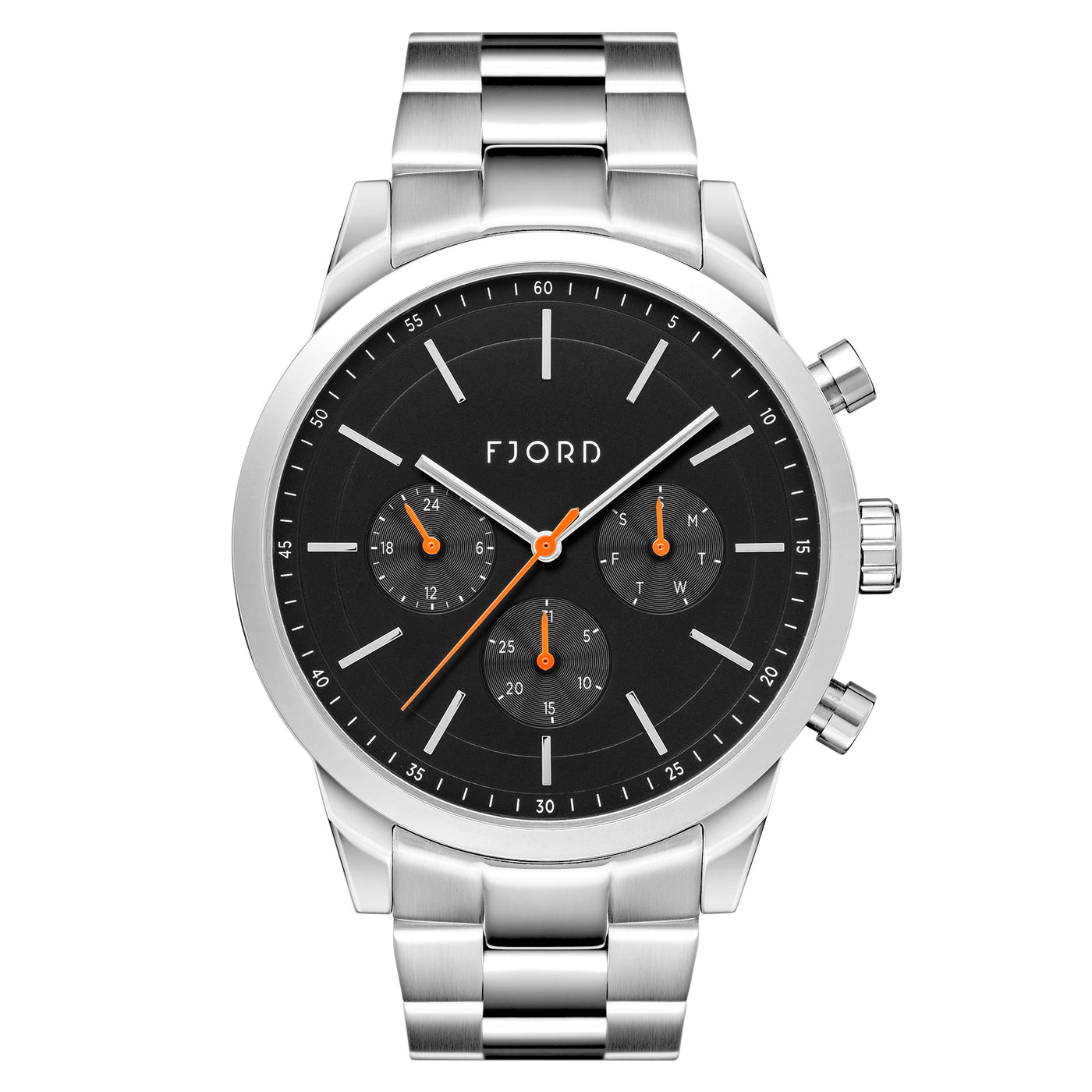MOVEMENT : Japan Quartz Multi-function CASE MATERIAL : Stainless Steel CASE DIAMETER (mm) : 40 DIAL : Silver white BAND : Black Strap WATER RESISTANCE : 3 ATM